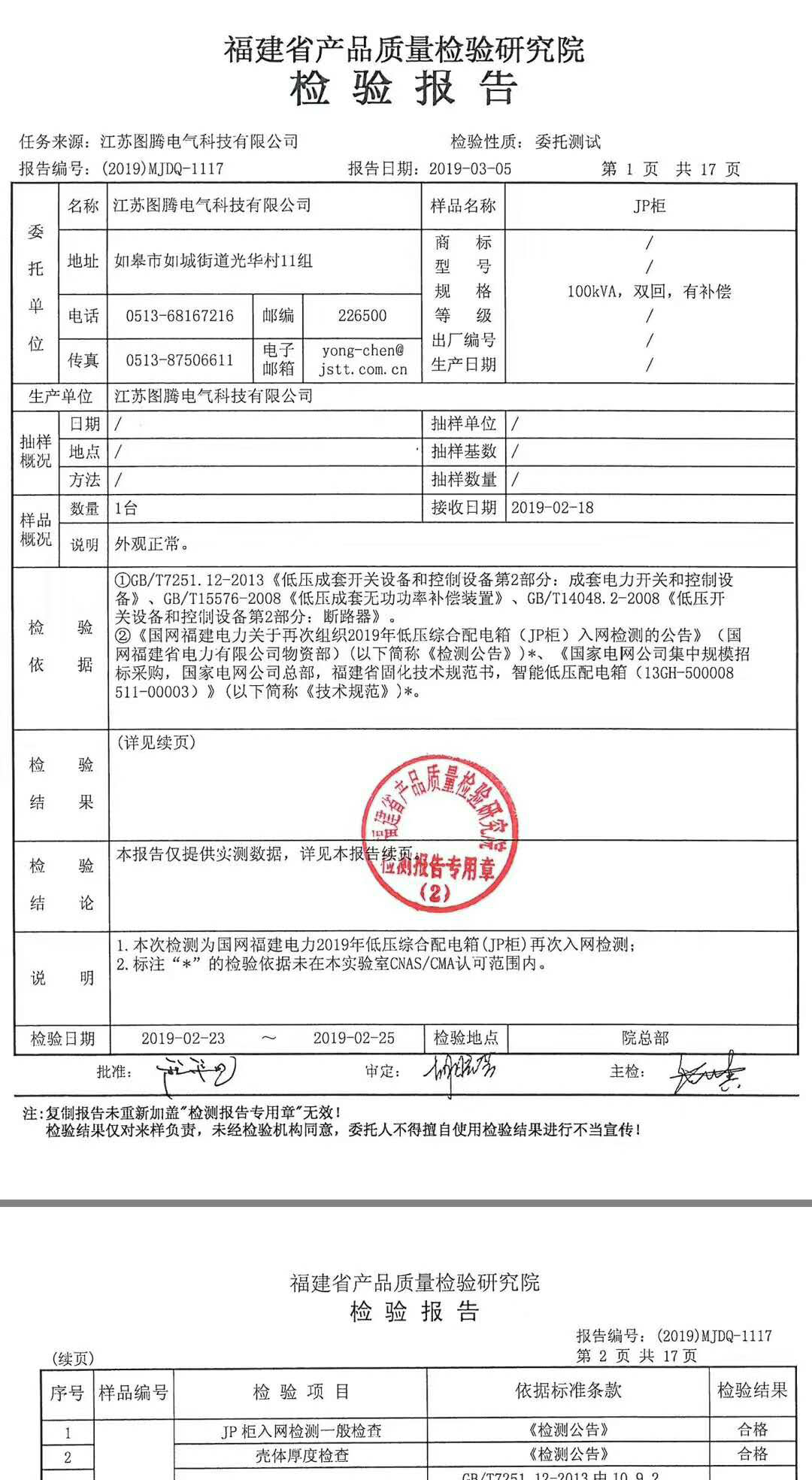 江蘇圖騰電氣科技有限公司綜合配電箱順利通過福建省入圍檢測!